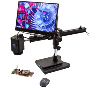 Sistema de Inspeção e Medição IS-4K com Autofoco, 4K Ultra HD, em stand industrial, com ecrã
